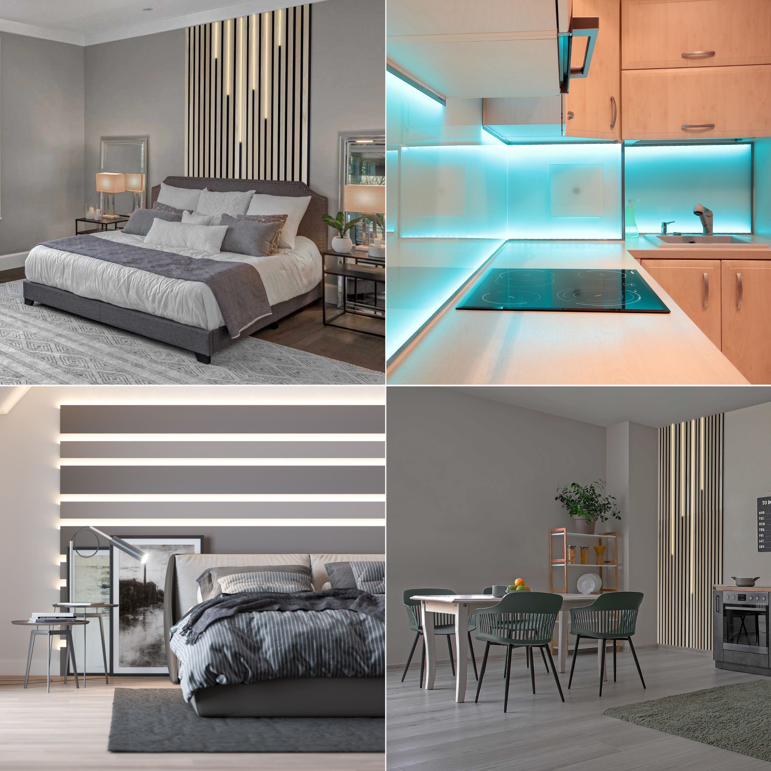 - EINSATZMÖGLICHKEITEN: Die selbstklebenden LED Bänder können nahezu überall im Innenbereich angebracht werden – z.B. auch in Kombination mit unseren Lichtleisten. Die Installation im Bad oder ähnlichen Umgebungen wird nicht empfohlen, da die LED-Bänder nicht spritzwassergeschützt sind.
