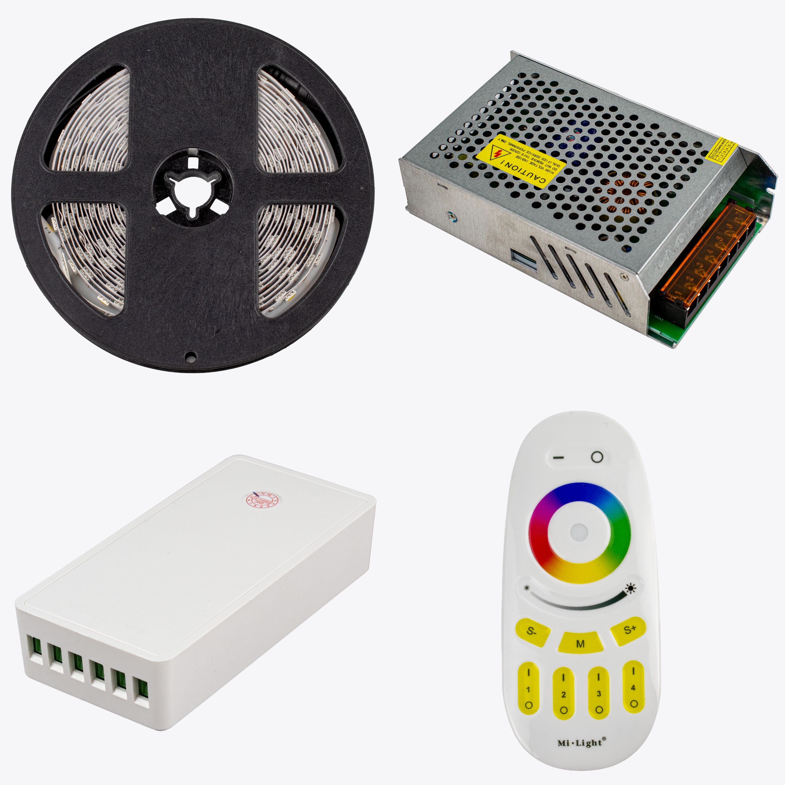 5m LED-Band, 1x Trafo 100W, 1x wahlweise Controller mit Fernbedienung und 1x Verbinder |