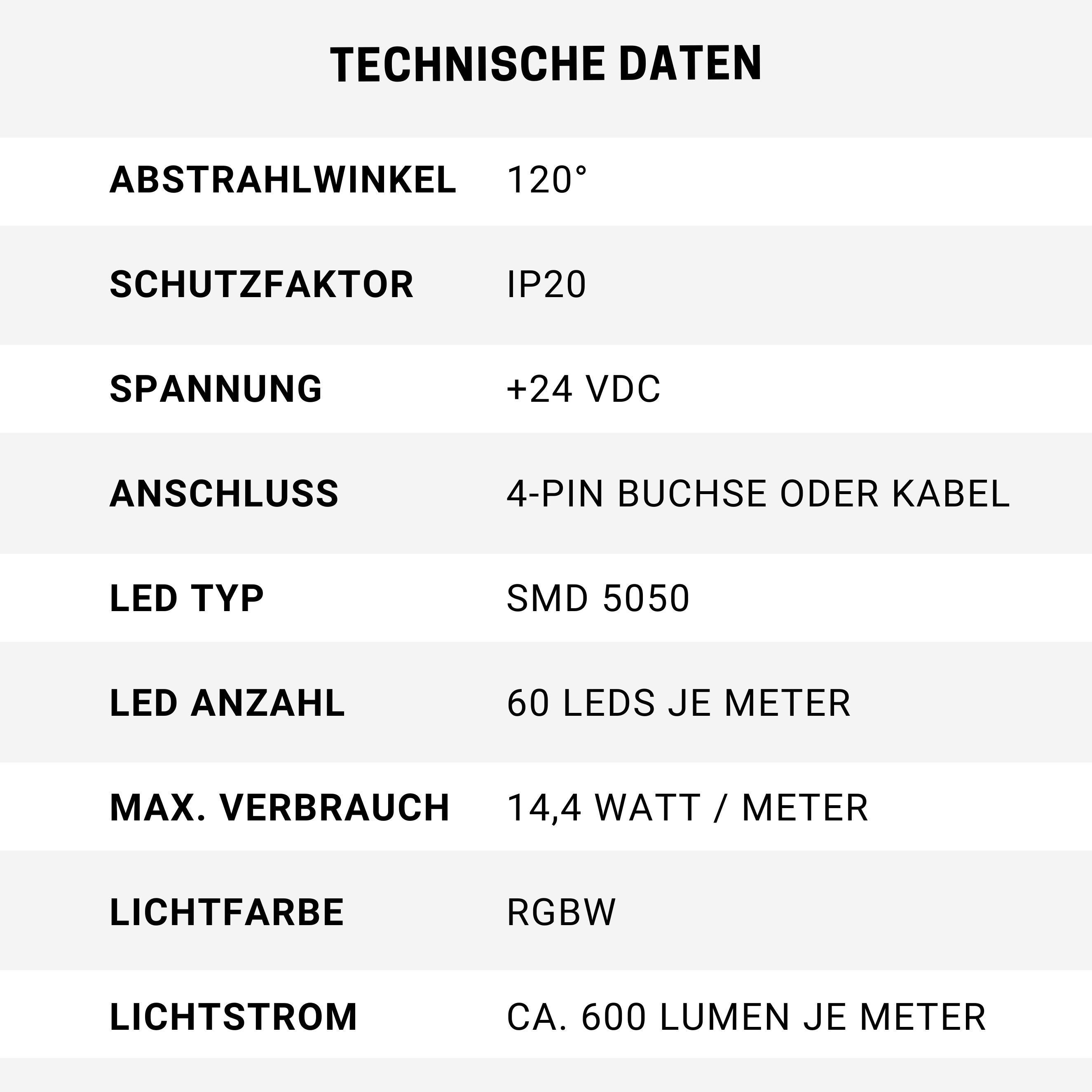 - LED TYP: SMD 5050 als RGBW Band – ermöglicht einen Wechsel zwischen buntem Licht und Warmweiß Licht