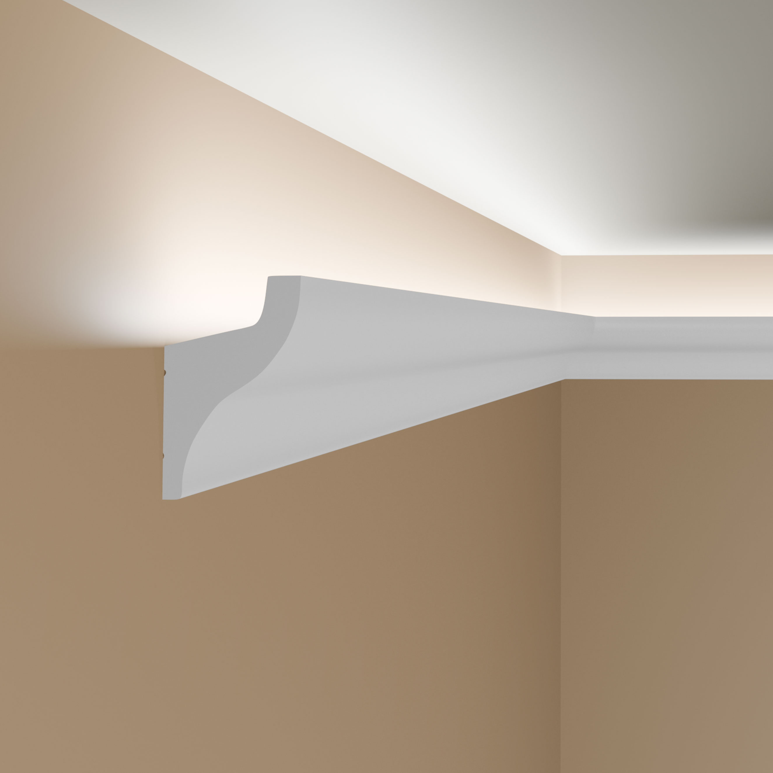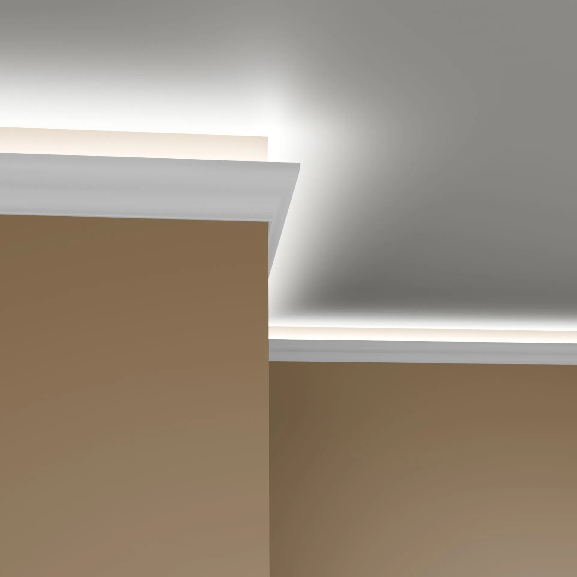 Unsere stilvoll gestalteten Deckenleisten sind für jede Raumgestaltung geeignet. Das zeitlose und moderne Profildesign sorgt für ein harmonisches Gesamtbild und eine nahtlose Verbindung von Wand und Decke. In der Nut dieser Leisten können flexible LED-Streifen eingefügt werden. Die indirekte LED-Beleuchtung schafft eine warme und einladende Atmosphäre. Passendes LED-Zubehör ist ebenfalls in unserem Shop erhältlich.